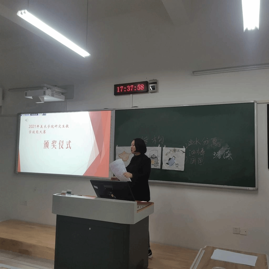 本次比赛一等奖获得者:靖丹丹《走下神坛》;二等奖获得者:杨小慧《秦陵兵马俑》、吴明春《“壶”思乱想》;三等奖获得者李琪琳《点线面》、韩欣芯《建党100周年黑板报》、戴秋阳《静物画有声》。希望通过此类的活动比赛,让同学们得到锻炼,提高我院研究生同学教学能力和教学水平,进一步提升人才培养质量,为培养人才打好基础。