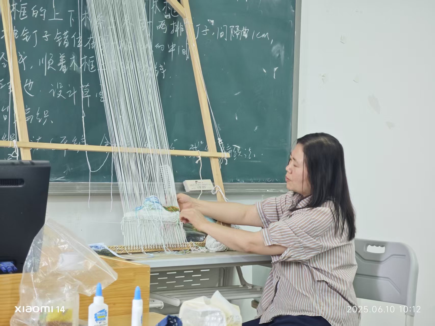 示范课上,陈素华教授先系统介绍纤维艺术的种类、发展历史,详细讲解示范作品的制作流程与核心技法,包括交织、锁经、栽绒、收尾等编织法,还解析了设计木框、梭子、钩针等编织必备工具的选择与用途。