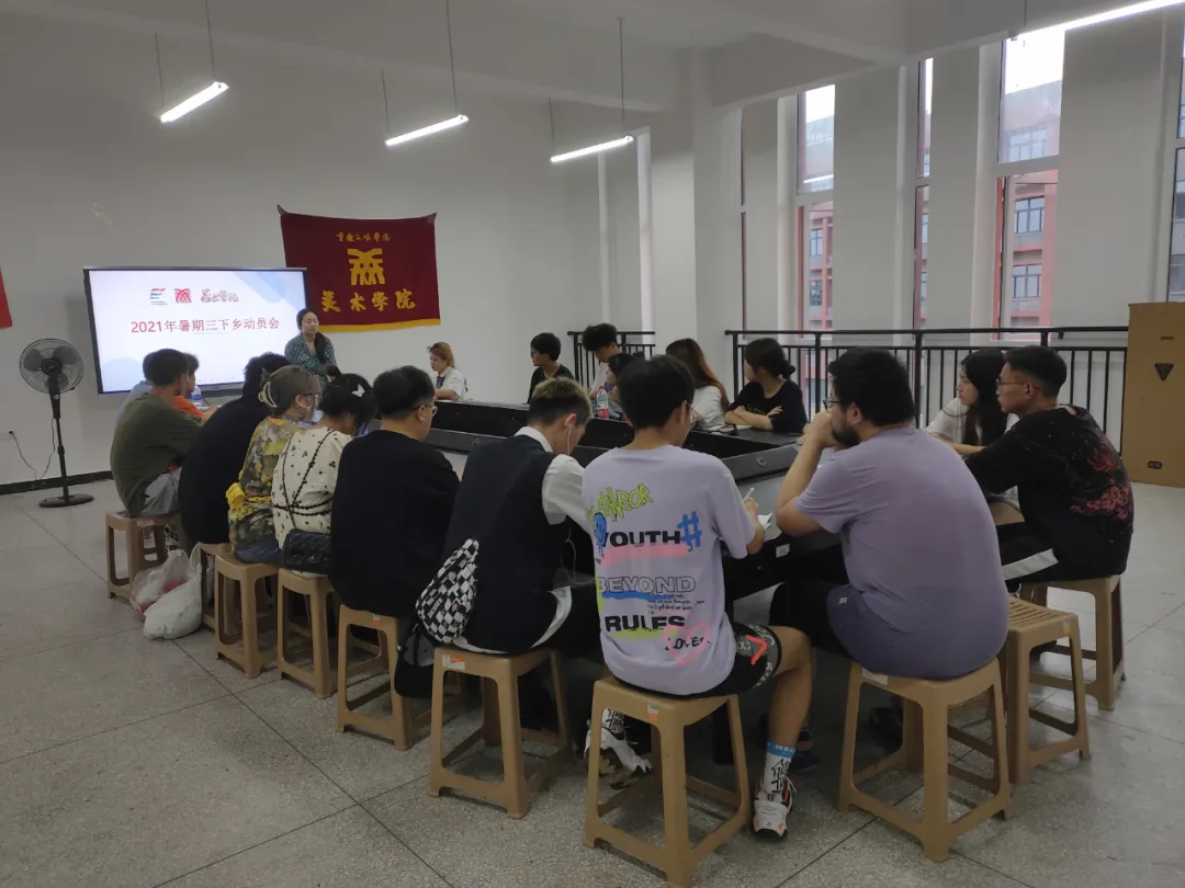 会议伊始,刘荣君老师对本次暑期“三下乡”社会实践活动组织情况进行说明,讲解本次三下乡主要任务:服务乡村振兴,重点结合恒心村情况以美术绘画、景观设计等方式建设美丽乡村,提升村容村貌;开设“艺术小课堂”,采用水彩、国画、手工等多种形式来丰富青少年精神文化生活;为村内留守老人义务画像等,并对同学们进行了安全教育和纪律要求。