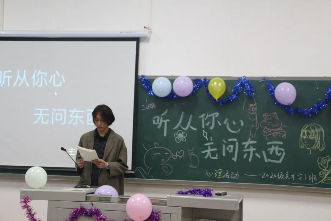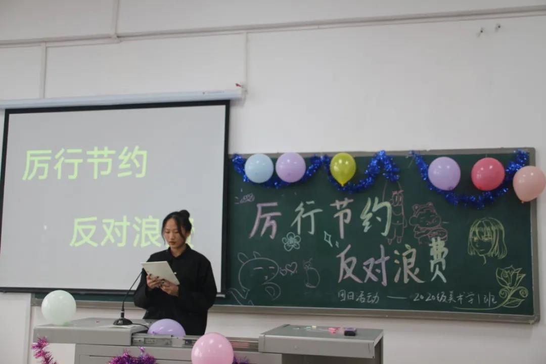 活动最后一环节也是气氛最轻松的一个环节——茶话会!同学们在教室里装饰了五颜六色的气球,黑板上绘画出各种各样有趣的图案,有的班级甚至还挂上了拉风的横幅,尽显美术生的独特风采!同学们依次上台进行了自我介绍,给大家分享了自己美丽的家乡以及日常的奇闻趣事!本次活动的主要目的是弘扬勤俭节约的传统美德,拉进同学之间的距离,增进彼此感情,活跃班级气氛。