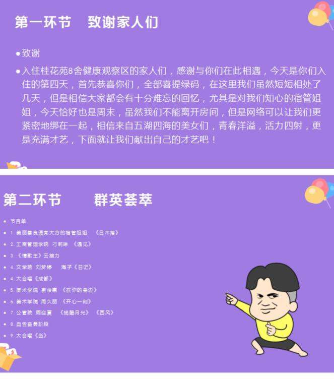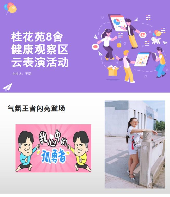 周末,王老师担心健康观察区的同学们心中压抑。于是她从现实条件出发,深入了解了每一位同学的心理状况并征询了大部分同学的意愿,在9月24日如期开展了“桂花苑8舍健康观察区云表演活动”。该活动以腾讯会议的形式开展,来自五湖四海的同学们齐聚云端,开始自己的表演。热情的员工,热心的宿管阿姨一起参与,云端十分热闹。虽然同学们不能离开房间,但是网络可以让我们更加紧密地依靠在一起,通过此次活动,大家的关系也更加亲近!